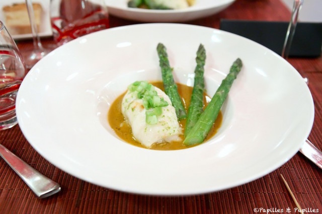 - Blanc de carrelet au velouté de crabe et asperges vertes au combava