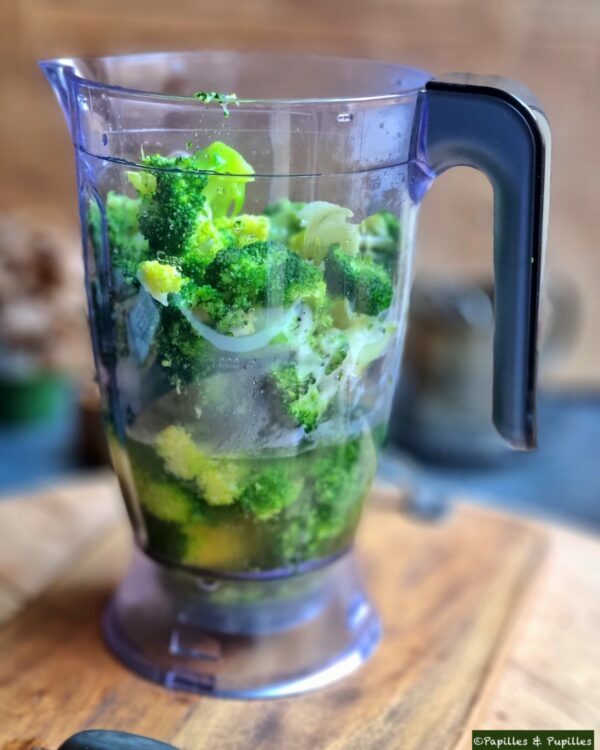 Dans le bol du blender, mettez les fleurettes de brocolis, le bouillon de volaille le lait et la crème fraîche et mixez. Pour cette recette, un blender est vraiment indispensable afin d’obtenir une consistance veloutée. Ou alors un mixeur de compétition. Mais avec mon mixeur basique, je n’arrive pas à avoir l’émulsion (bon il a 25 ans donc c’est peut être pas super efficace non plus).