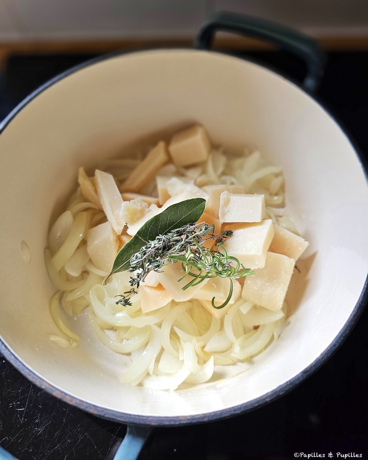 Versez l’huile d’olive dans une cocotte et faites-la chauffer. Ajoutez les lamelles d’oignon et laissez-les suer sans coloration pendant 5 minutes en mélangeant régulièrement. Puis ajoutez les morceaux de Parmesan préalablement coupés, mélangez et ajoutez également le romarin, le thym et le laurier.