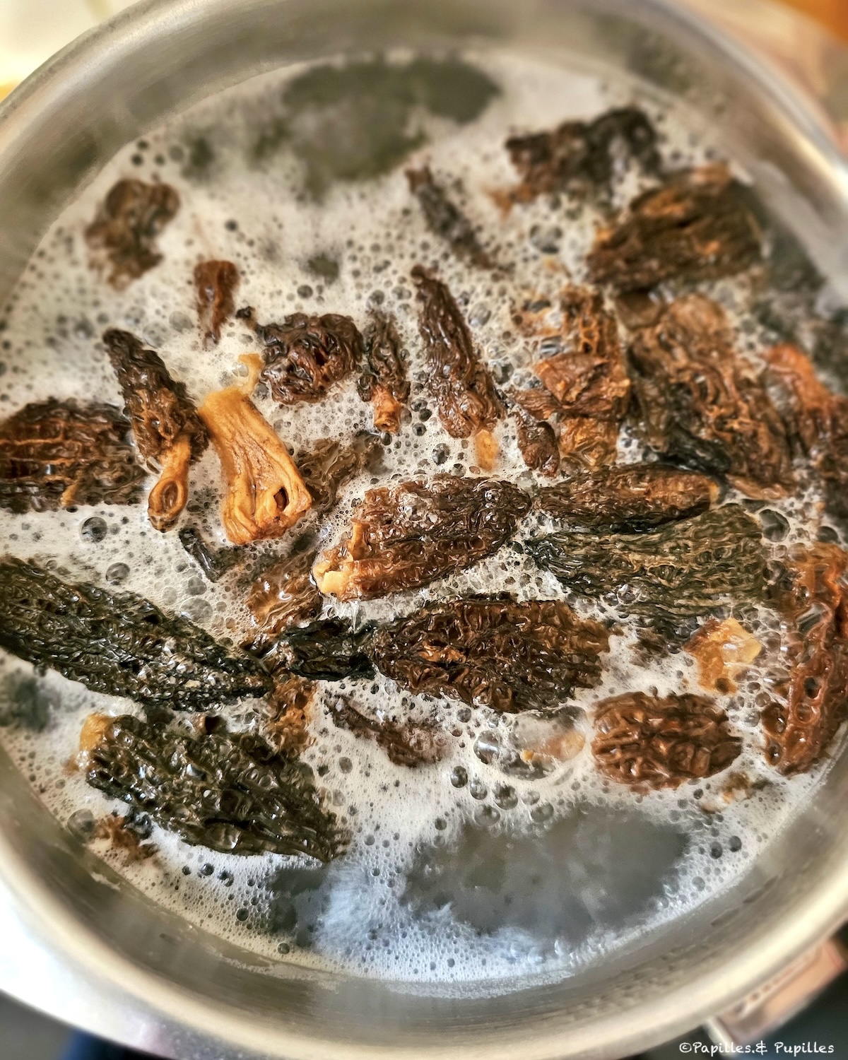 Une fois le trempage effectué, récupérez les morilles réhydratées (elles ont repris l’aspect de morilles fraîches) et conservez l’eau de trempage. C’est ce mélange qui donnera toute sa saveur à la sauce. » Je n’ai pas essayé mais ça semble intéressant gustativement 😉