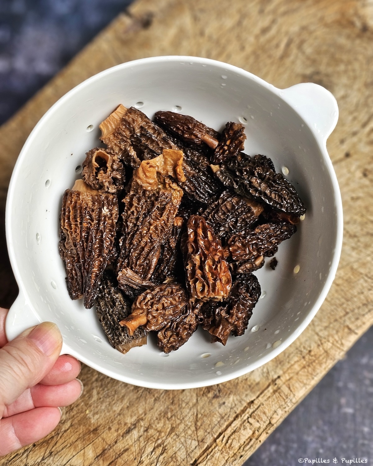 Petit rappel important, parce que la question revient souvent : les morilles fraîches crues sont toxiques et doivent toujours être bien cuites. Les morilles séchées, elles, ont vu leurs toxines détruites lors du processus de déshydratation. Une fois réhydratées, elles ne présentent donc pas le même risque et se cuisinent normalement, comme ici simplement poêlées.