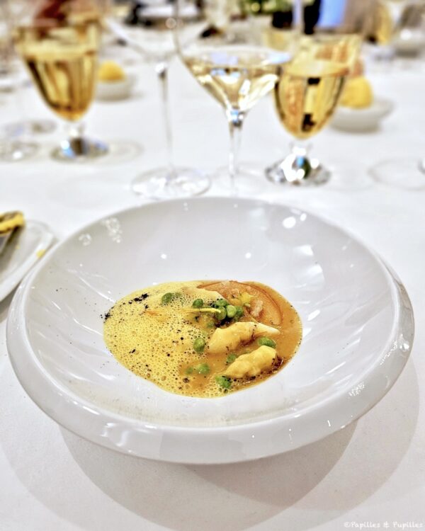 Ces pointes d’asperges blanches, petits pois curry, tranche de citron Meyer préservé sans sucre (une technique de Yannick Alleno). J’ai eu un énorme coup de cœur pour ce plat savoureux, aux parfums envoûtants qui comporte le petit twist qui change tout : ce citron Meyer confit qui apporte l’acidulé sans la sucrosité.